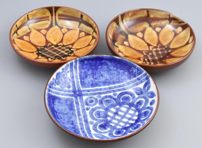 Borsódy Ágnes (1936-): Retró iparművész festett mázas fali kerámia dísztányérok, 3 db, jelzettek, az egyiken kis lepattanással, a másik kettő hibátlan, d: 20,5 cm és 18 cm közötti méretben
