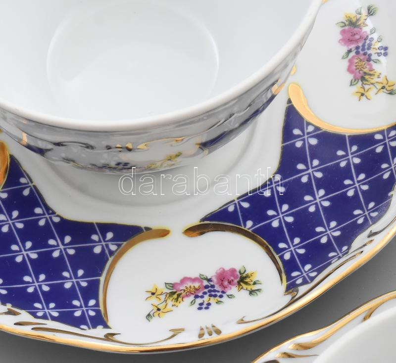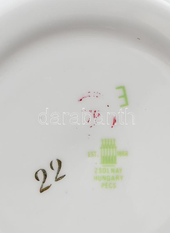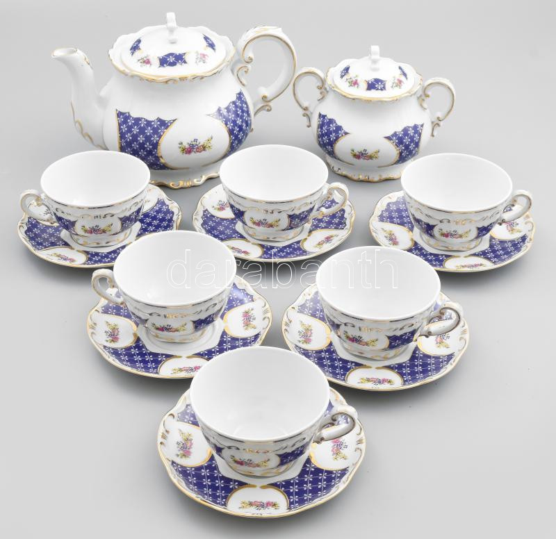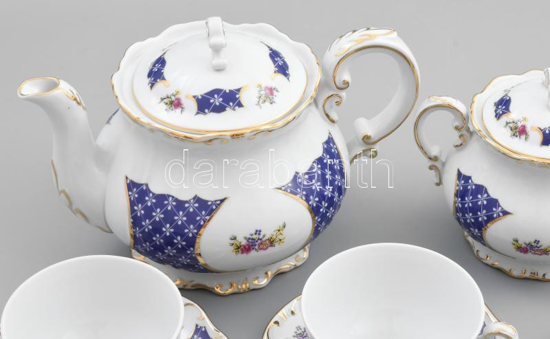 Beschreibung: Zsolnay lila virág mintás teás készlet. Hat személyes, matricás, jelzett, hibátlan