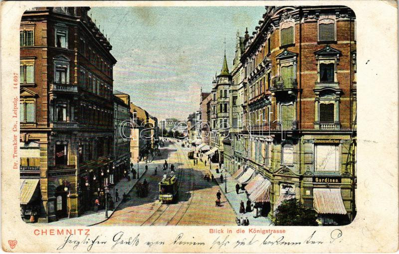 Beschreibung: 1905 Chemnitz, Blick in die Königstrasse, Damenconfection, Gardinen / street view, tram, shops. Dr. Trenkler Co. (fl)