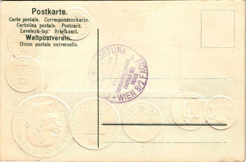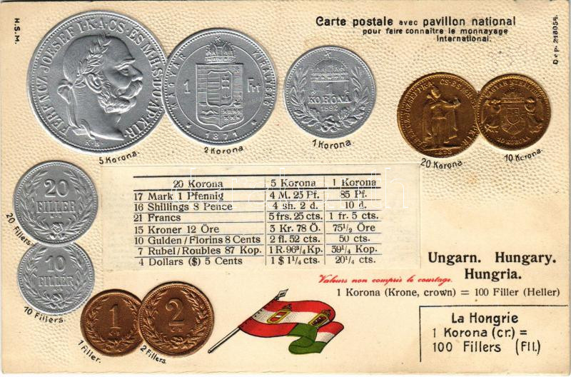 Magyar pénzérmék, ezüst és arany díszített dombornyomott / Ungarn / Hungarian flag and set of coins with crone. H.S.M. golden and silver Emb. litho (lyukak / pinholes)