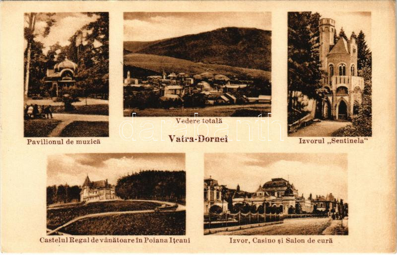 Vatra Dornei, Dornavátra, Bad Dorna-Watra (Bukovina, Bukowina); Pavilonul de muzica, Vedere totala, Izvorul Sentinela, Castelul Regal de vanatoare in Poiana Itcani, Izvor, Casino si Salon de cura / spa, music pavilion, spring sources, castle, casino, baths (EK)