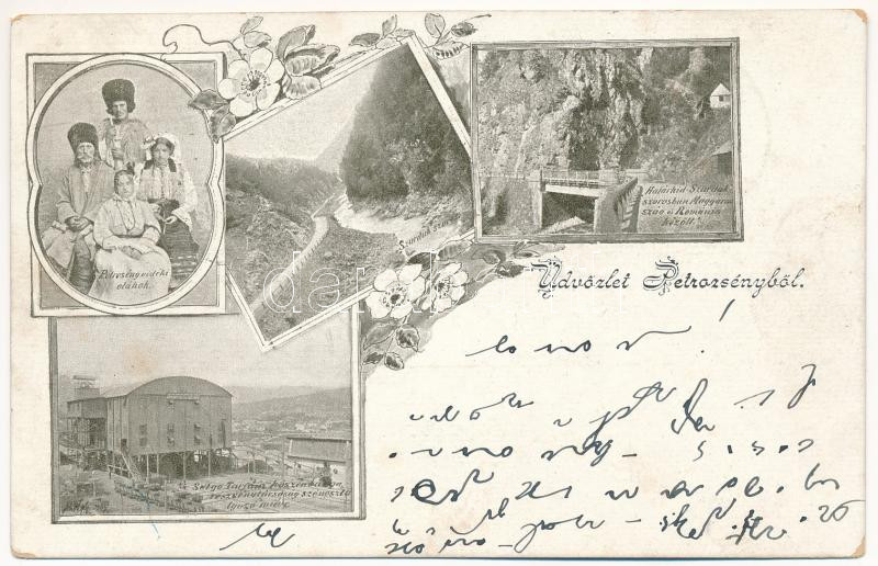 1899 (Vorläufer) Petrozsény, Petrosani; vidéki oláhok, határhíd a Szurdoki-szorosban Magyarország és Románia között, Salgótarjáni kőszénbánya részvénytársaság szénosztályozó műve, iparvasút / Vlach folklore, border bridge between Hungary and Romania, coal mine, industrial railway. Art Nouveau, floral