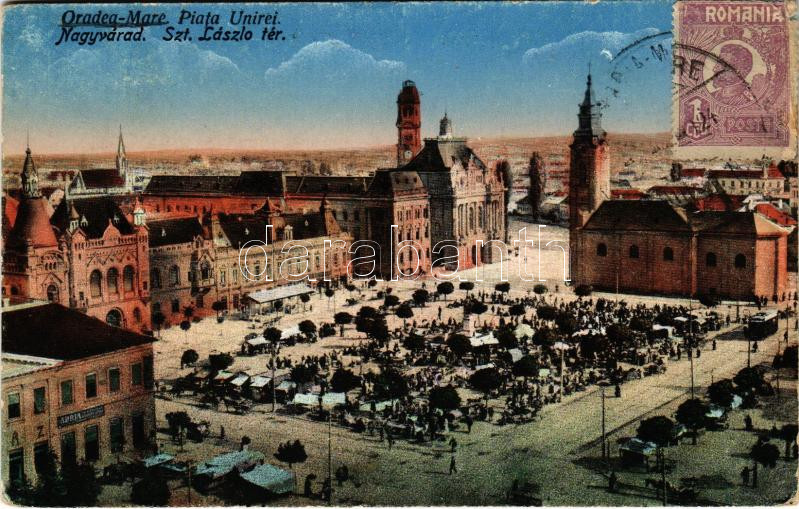 1924 Nagyvárad, Oradea; Szent László tér, piac, városháza, villamos, Adria biztosító társaság. Sebő Imre kiadása / square, market, town hall, tram, insurance company (Rb)