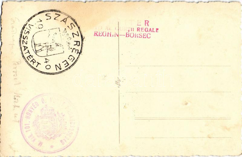 Beschreibung: 1940 Borszék, Borsec; Foto Heiter (Reghin-Borsec) photo + "1940 Szászrégen visszatért" So. Stpl. + "M. kir. 101. honvéd Ö. vonatparancsnokság" (apró lyuk / tiny pinhole)