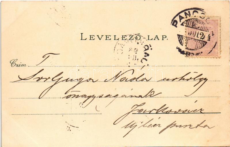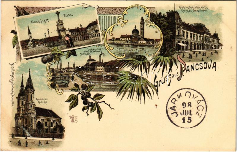 1898 (Vorläufer) Pancsova, Pancevo; Franz Josef-Platz, Griech.-ort. Kirche, Bräuhaus, Gebäude d. röm. Kath. Kirchen Gemeinde / Ferenc József tér, Ortodox templom, Római katolikus egyház bérpalotája, sörgyár. Mészáros & Kohn kiadása / square, Orthodox church, palace, brewery. Art Nouveau, floral, litho (EK)