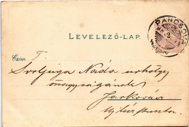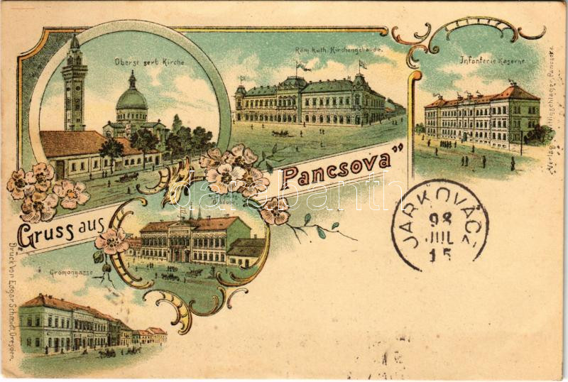 1898 (Vorläufer) Pancsova, Pancevo; Szerb templom, Gyalogsági laktanya, Gromon utca, bíróság, katolikus egyház épülete. G. Wittigschlager kiadása / Serbian Orthodox church, K.u.K. military infantry barracks, street view, court. Art Nouveau, floral litho (EK)