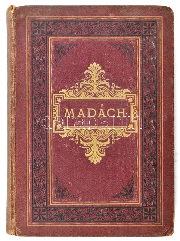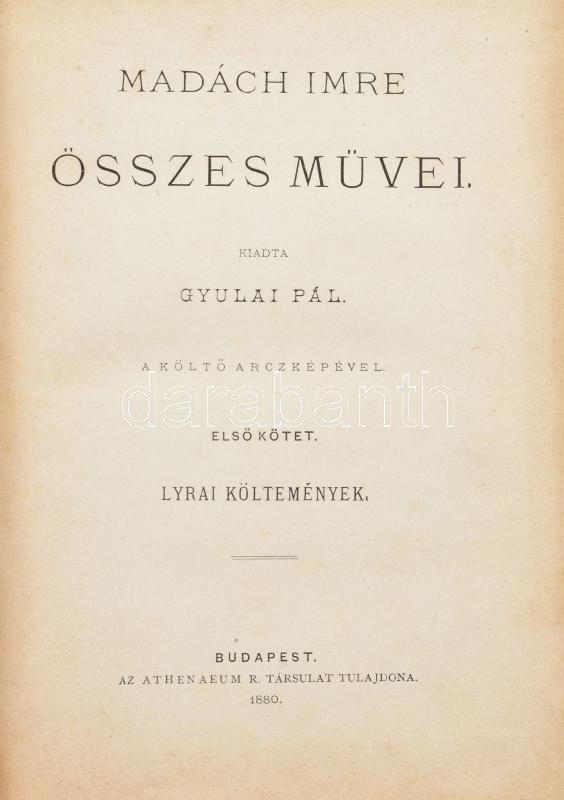 Madách Imre összes művei. I. kötet: Lyrai költemények. Kiadta: Gyulai Pál. Bp., 1880, Athenaeum, 1 (címkép) t. + XXXVIII+279+(7) p. Kiadói aranyozott, dombornyomott egészvászon-kötés, aranyozott lapélekkel, kissé foltos, kopottas borítóval, helyenként kissé foltos lapokkal.