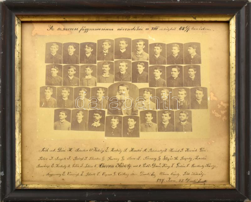 1887 A szarvasi főgimnázium VIII. osztályos növendékei az 1886/87. tanévben, tablófotó, kézzel írt névsorral (osztályfőnök: Chován Károly), üvegezett fakeretben, kisebb sérülésekkel, teljes méret: 25,5x29 cm
