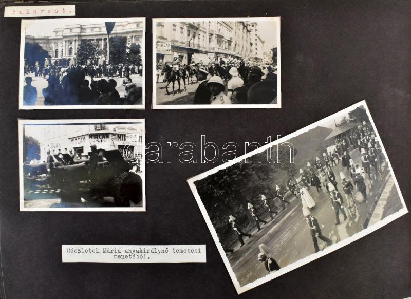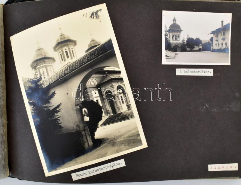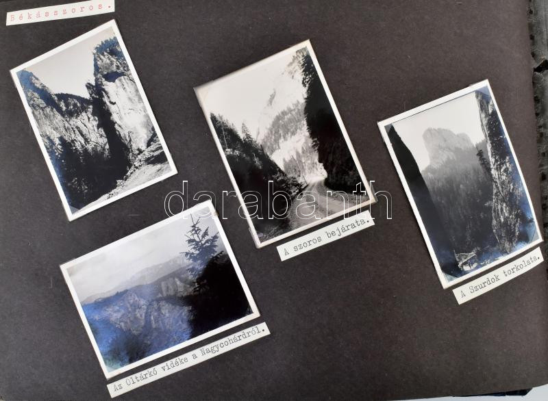 1938 Nyár Erdélyben és a Regátban, albumba beragasztott fotók és fotólapok, feliratozva, vegyes méretben (Kolozsvár, Sinaia, Bukarest, Tordai-hasadék, Békás-szoros, Brassó, Segesvár, Szováta, Borszék, Marosvásárhely, Gyergyószentmiklós, Szent-Anna-tó, Székelyudvarhely, Zetelaka, Mária anyakirálynő temetési menete)