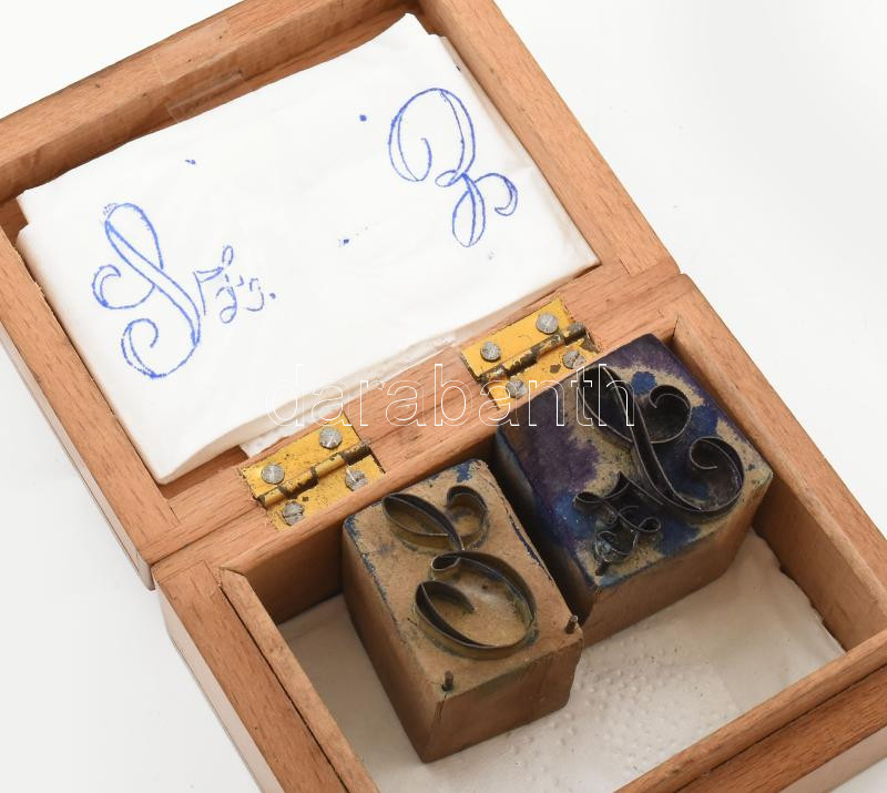 Régi névjegy / pecsét tartó fa dobozka, fedelén koronás magyar címerrel díszítve, benne "Sz" és "B" betűs, monogramos nyomódúcok. Doboz mérete: 8,5x6,5x3,5 cm