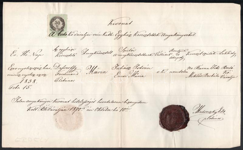 Beschreibung: 1870 Boldogkőváralja, keresztelési anyakönyvi kivonat 50 kr okmánybélyeggel, viaszpecséttel