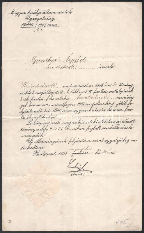 Beschreibung: 1907 Bp., M. Kir. Államvasutak kinevezési okirat Günther Árpád MÁV hivatalnok részére, felzetes szárazpecséttel, hajtva, 34x21 cm