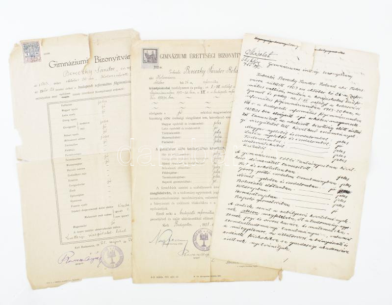 1921-1925 Bp., a budapesti református főgimnázium által kiállított gimnáziumi érettségi bizonyítvány + kézzel írt, hiteles másolat + gimnáziumi bizonyítvány; torboszlói Bereczky Sándor részére kiállítva. Vegyes állapotban, okmánybélyegekkel.