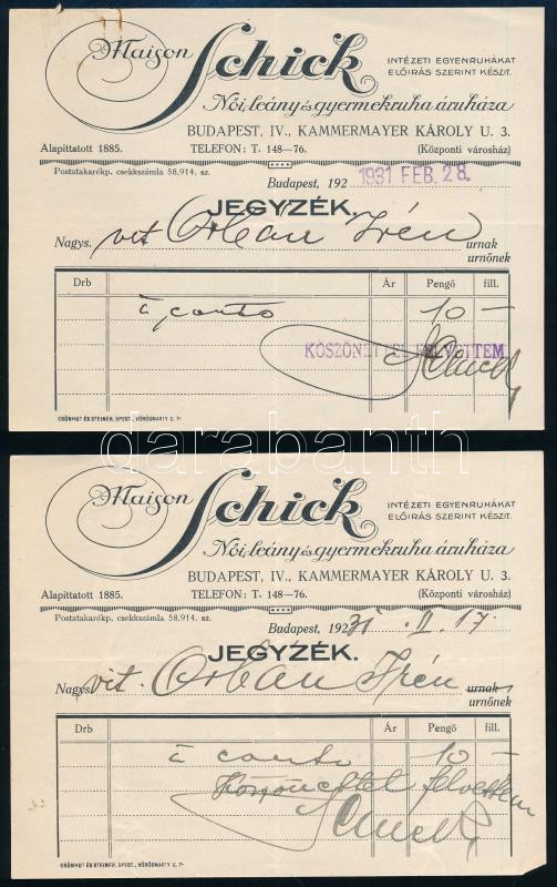 Beschreibung: 1931 Maison Schick női, leány és gyermekruha áruháza (Bp., Kammermayer Károly u. 3.), 2 db fejléces számla