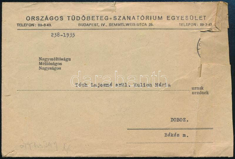 1935 Országos Tüdőbeteg-Szanatórium Egyesület gépelt levele, fejléces ... https://www.darabanth.com/de/445-Fernauktion/445.0/Kunst-Dokumente-andere-Sammelgebiete/Dokument~500020/1935-Orszagos-Tudobeteg-Szanatorium-Egyesulet-gepelt-levele-fejleces-papiron-boritekkal-~II2945634