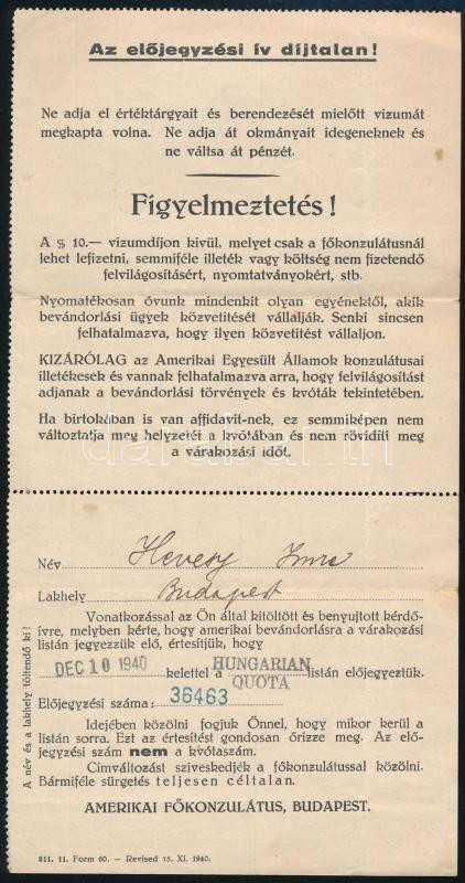 1940 Értesítés az USA magyar bevándorlási kvótalistájára történt elője... https://www.darabanth.com/de/445-Fernauktion/445.0/Kunst-Dokumente-andere-Sammelgebiete/Dokument~500020/1940-Ertesites-az-USA-magyar-bevandorlasi-kvotalistajara-tortent-elojegyzesrol~II2944751