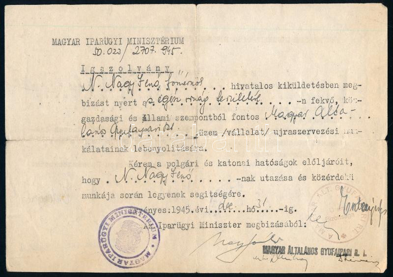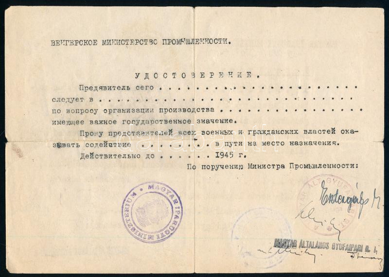 1945 Magyar Iparügyi Minisztérium által kiállított, kétnyelvű (magyar, orosz) igazolvány, utazási engedély az ország egész területére, aláírásokkal, bélyegzőkkel