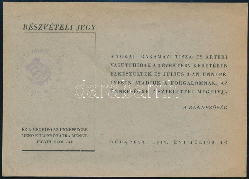 1949 A Tokaj-Rakamazi vasúti hidak megnyitására a különvonatra szóló r... https://www.darabanth.com/de/445-Fernauktion/445.0/Kunst-Dokumente-andere-Sammelgebiete/Dokument~500020/1949-A-Tokaj-Rakamazi-vasuti-hidak-megnyitasara-a-kulonvonatra-szolo-reszveteli-jegy-jo-C3~II2944075