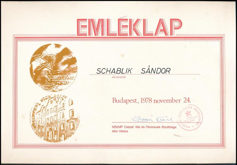 Beschreibung: 1978 Schablik Sándor tanácsköztársasági forradalmár, munkásÅ‘r parancsnok részére kiállÃtott emléklap, Ernszt Antal (1931-2015), az MSzMP Csepel Vas- és Fémművek Bizottsága elsÅ‘ titkára, késÅ‘bbi MSzMP KB-tag (1980-85) autográf aláÃrásával.