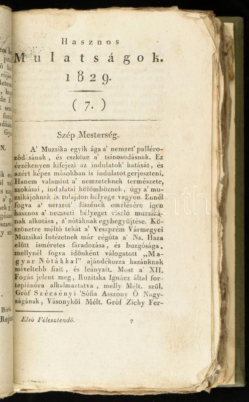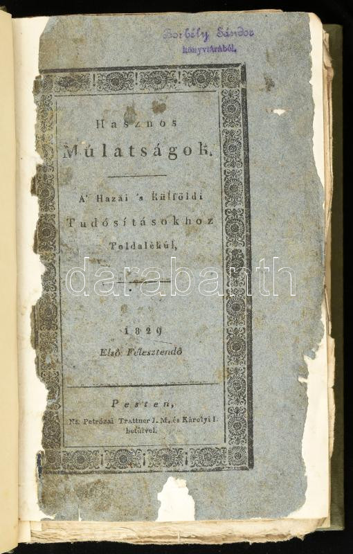 1829 [H]Asznos mulatságok. A' Hazai 's külföldi Tudósításokhoz Toldalékúl [adja Özv. Kultsár Istvánné.] 1829. Első Félesztendő. 1-10,12-50. szám.Pesten, 1829., Petrózai Trattner J. M. és Károlyi István, 1-80,89-398 p. Átkötött egészvászon-kötés, bekötött papír védőborítókkal, restaurált lapokkal: az elején a borító és az első 4 lap, valamint a végén az utolsó 23 lap és a borító, foltos lapokkal, nem teljes: a 11., és a 51-52. számok hiányosnak.