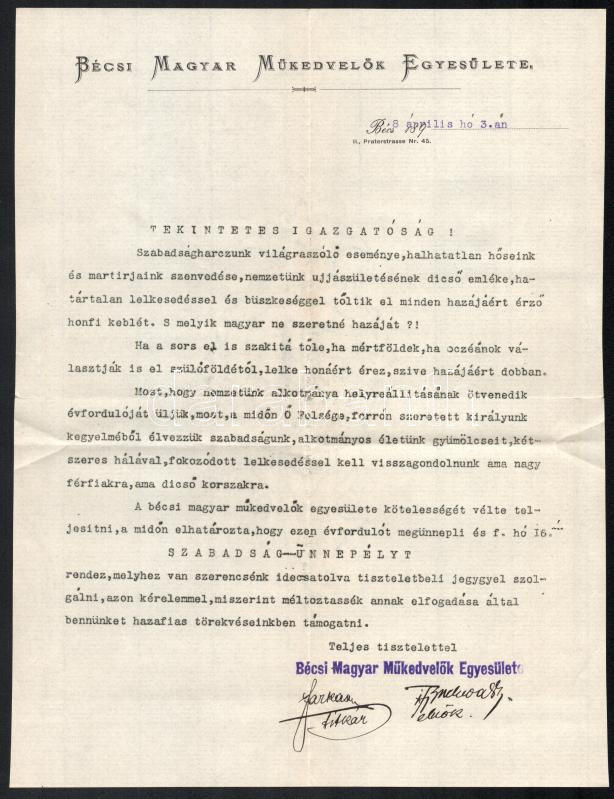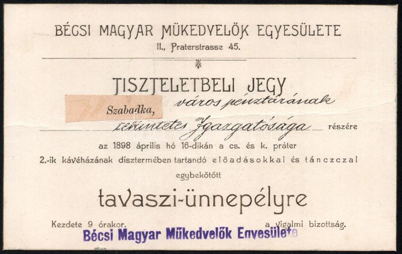 1898 Bécsi Magyar Műkedvelők Egyesülete meghívó és tiszteletjegy Szaba... https://www.darabanth.com/de/445-Fernauktion/445.0/Kunst-Dokumente-andere-Sammelgebiete/Drucksachen~1500005/1898-Becsi-Magyar-Mukedvelok-Egyesulete-meghivo-es-tiszteletjegy-Szabadsag-unnepelyre-az-~II2941269