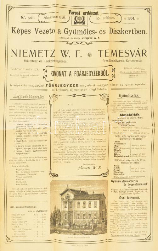 1904 Temesvár Niemetz. W. F. - Városi díszkert képes reklám nyomtatván... https://www.darabanth.com/de/445-Fernauktion/445.0/Kunst-Dokumente-andere-Sammelgebiete/Drucksachen~1500005/1904-Temesvar-Niemetz-W-F-Varosi-diszkert-kepes-reklam-nyomtatvany-46x32-cm~II2941274