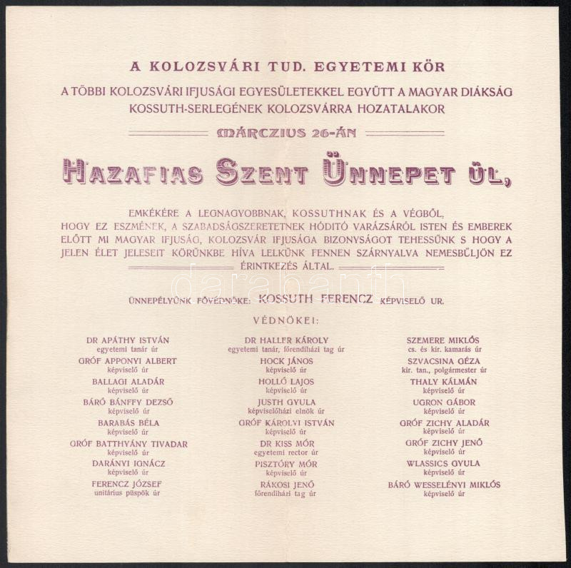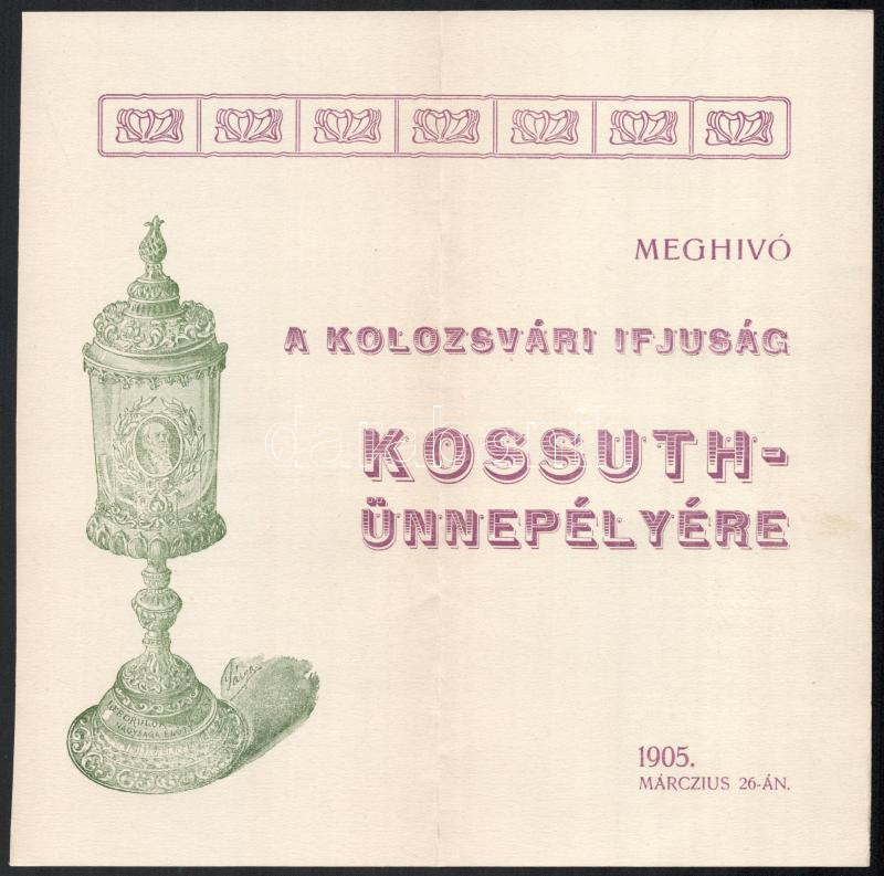 1905 A Kolozsvári Tudományos Egyetemi Kör Kossuth ünnepélyének díszes ... https://www.darabanth.com/de/445-Fernauktion/445.0/Kunst-Dokumente-andere-Sammelgebiete/Drucksachen~1500005/1905-A-Kolozsvari-Tudomanyos-Egyetemi-Kor-Kossuth-unnepelyenek-diszes-meghivoja-hajtva-22x~II2941246