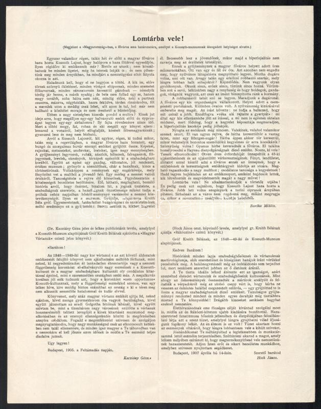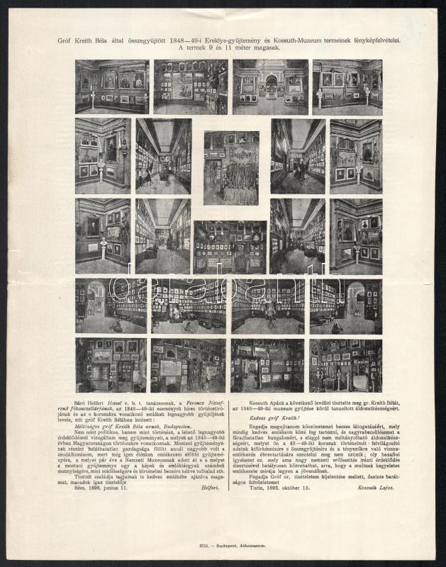Beschreibung: 1907 gr. Kreith Géza 1848-as ereklyegyűjteménye és Kossuth múzeum elzárt termeinek fényképe és a nyilvánosság előtt való megnyitásukról szóló cikkek egy röplapon 20x30 cm