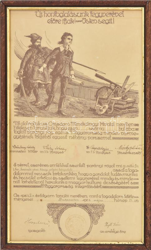 1922 Földereklye adományozási emléklap. "Mi alulirottak az Országos Menekültügyi Hivatal nevében hitelesen tanusitjuk, hogy ezen ... számu ... bullába foglalt parányi rög egész Magyarország minden vármegyéjének földjéből egyesit néhány porszemet" Üvegezett keretben, 46x28 cm