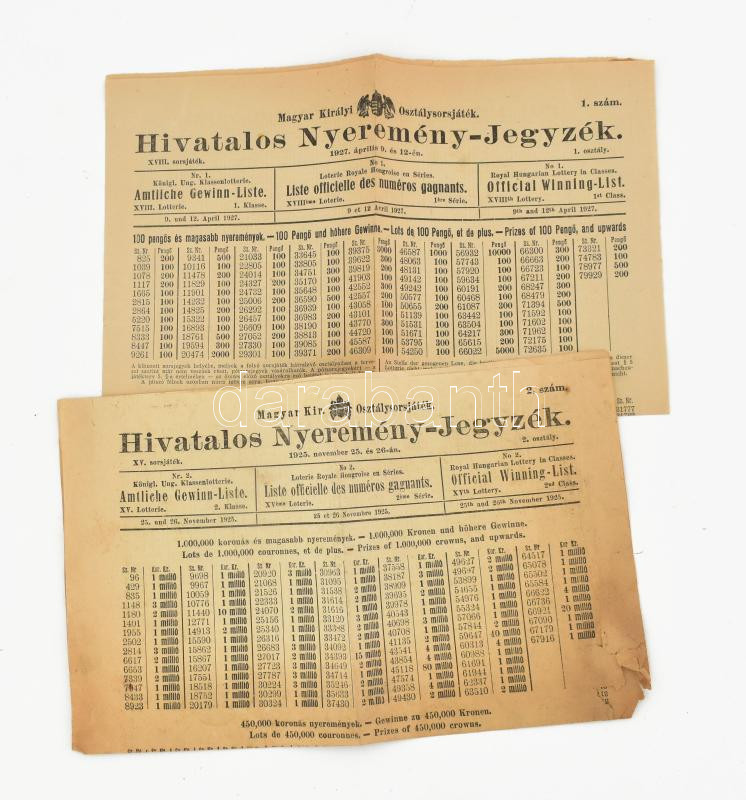 1925, 1927. 2db M.Kir. Osztálysorsjáték Hivatalos nyeremény-jegyzék https://www.darabanth.com/de/445-Fernauktion/445.0/Kunst-Dokumente-andere-Sammelgebiete/Drucksachen~1500005/1925-1927-2db-MKir-Osztalysorsjatek-Hivatalos-nyeremeny-jegyzek~II2944129