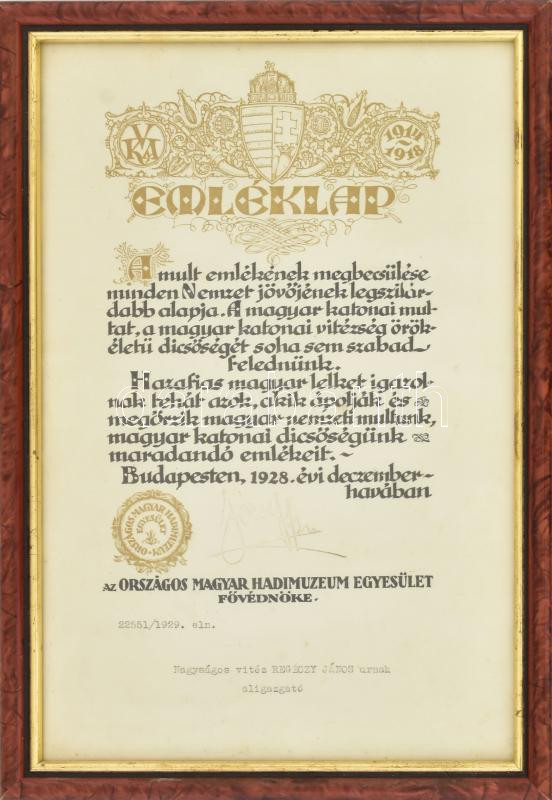 Beschreibung: 1928 Emléklap, Országos Magyar Hadimuzeum Egyesület, üvegezett keretben, 34x23 cm