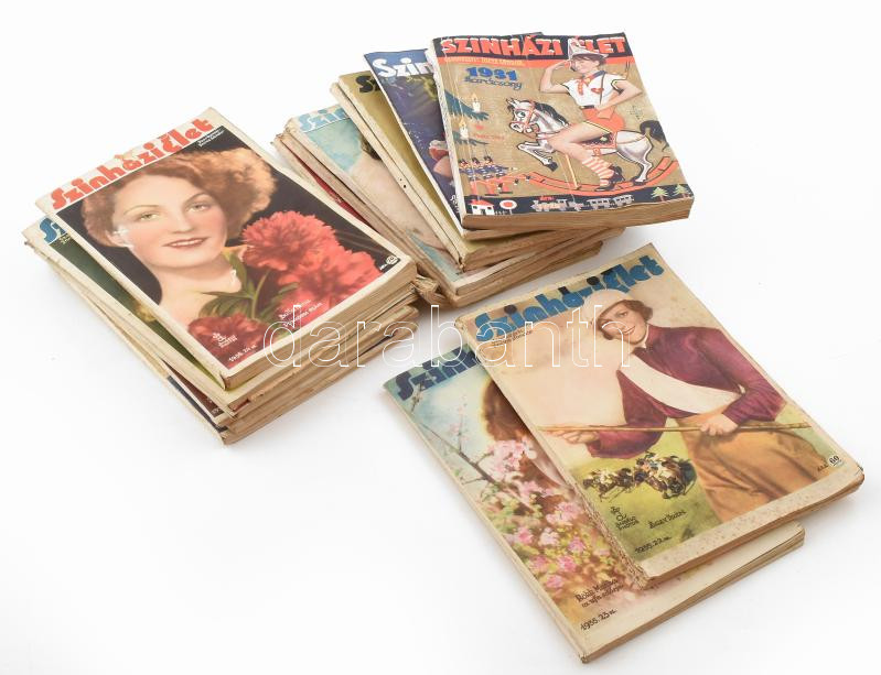 1931-1935 Színházi Élet 16 száma, közte 1931. karácsonyi szám, 1932. 18. 46. szám, 1935. 10.,13-16., 22-28., 37. számok. Változó állapotban, közte foltos borítókkal, néhány borítón és gerincen sérüléssel.