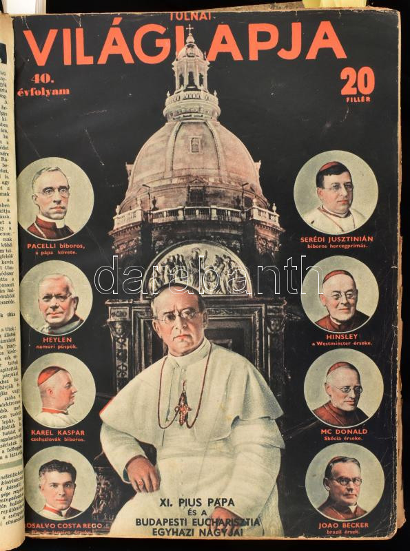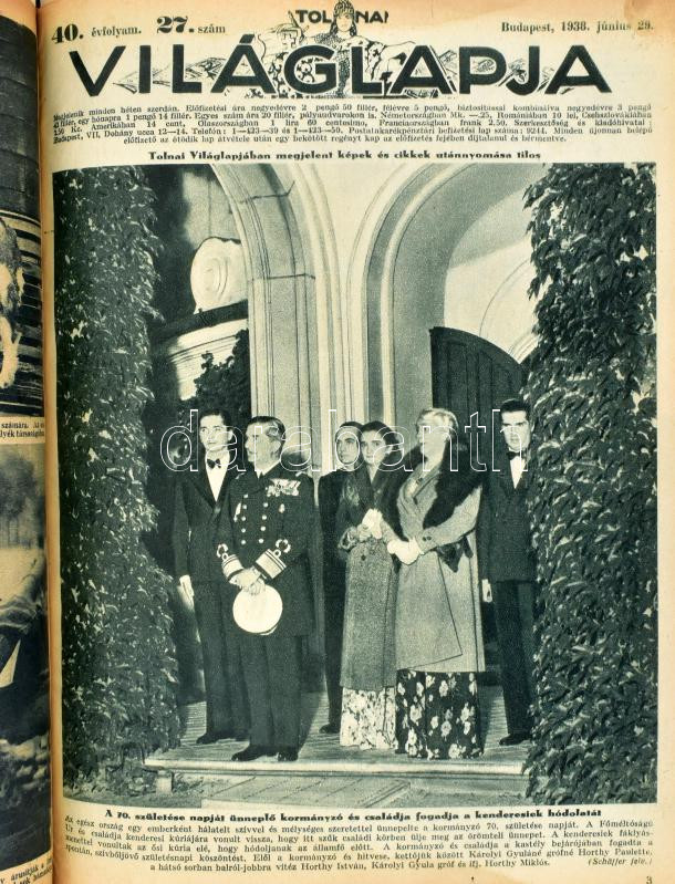 1938 Tolnai Világlapja 1938-as évfolyamának egybekötött számai, május-augusztusi számokból. A borítókat bekötötték, de az az első borítója hiányzik. Benne a kor híreivel. Gazdag képanyaggal illusztrált, rajtuk a kor ismert embereivel és történéseivel, Horthy Miklóssal 70. születésnapjával, az Eucharisztikus Kongresszussal, Mussolinivel, az egyik címlapon Erzsébet trónörökössel, a későbbi II. Erzsébettel. Átkötött félvászon-kötésben, kopott borítóval.