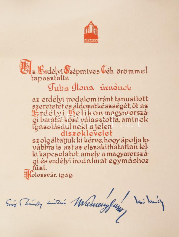 1942 Kolozsvár, Erdélyi Szépmíves Céh Erdélyi Helikon barátai közé választó díszoklevele rajta Bánffy Miklós, Kemény János, Kós Károly nyomtatott aláírásaival Eredeti tokkal