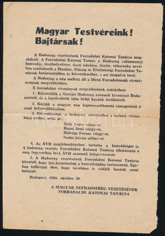1956-as röplap. Magyar Testvéreink! Bajtársak! október 30. https://www.darabanth.com/de/445-Fernauktion/445.0/Kunst-Dokumente-andere-Sammelgebiete/Drucksachen~1500005/1956-as-roplap-Magyar-Testvereink-Bajtarsak-oktober-30~II2943636