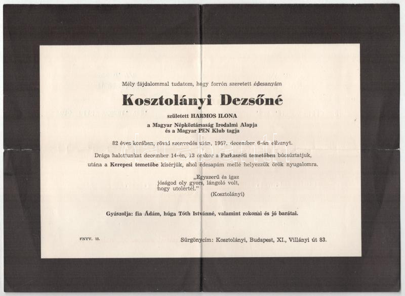 1967 Kosztolányi Dezsőné (1885-1967) Harmos Ilona (szül. Schlesinger),... https://www.darabanth.com/de/445-Fernauktion/445.0/Kunst-Dokumente-andere-Sammelgebiete/Drucksachen~1500005/1967-Kosztolanyi-Dezsone-1885-1967-Harmos-Ilona-szul-Schlesinger-szineszno-iro-Kosz~II2937998