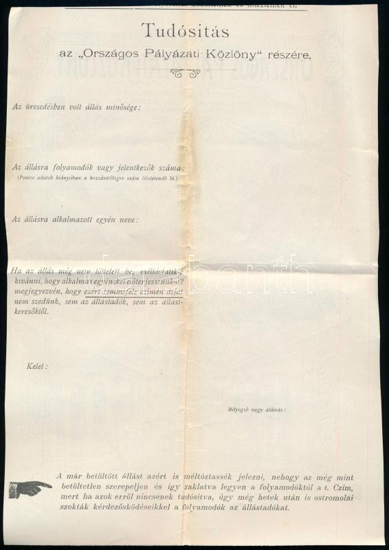 Beschreibung: cca 1890 Országos pályázati közlöny hirdetés feladására szolgáló nyomtatvány. 20x30 cm