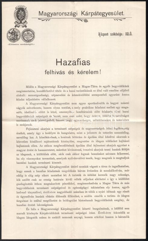 Beschreibung: cca 1900 A Magyarországi Kárpát Egyesület a Tátra megismertetésére felhívó hirdetménye, valamint csatlakozási felhívása