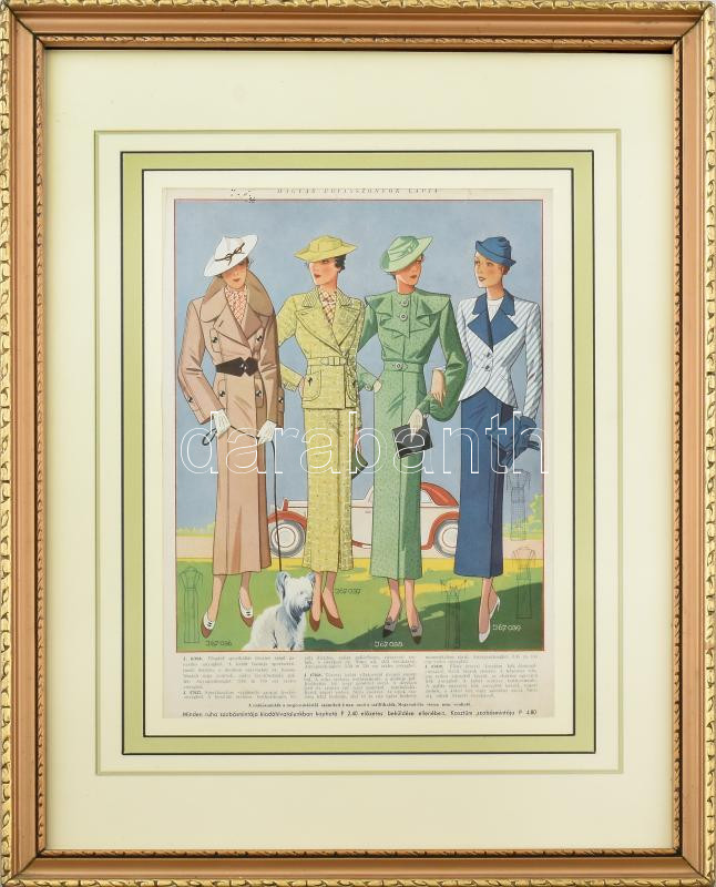 cca 1930 Elegáns hölgyek kalapban, színes art deco női divatkép a Magyar Uriasszonyok Lapjából, ofszet, papír, 28x20 cm. Dekoratív, üvegezett fakeretben.