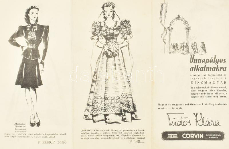 Beschreibung: cca 1930 "Ünnepélyes alkalmakra díszmagyar" -Tüdős Klára tervezése, Corvin Áruház, illusztrált szórólap