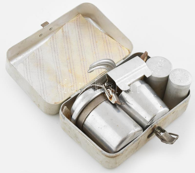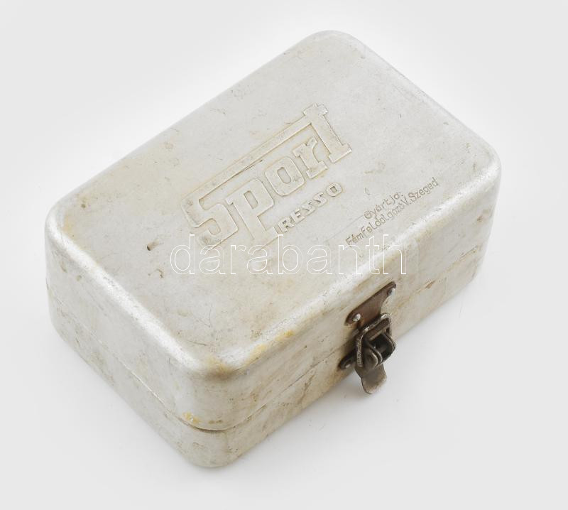 Sport Presso retró kávéfőző készlet, kétszemélyes (össz. 10 db). Gyártja: Fémfeldolgozó Vállalat, Szeged. Fém, eredeti dobozában, korának megfelelő állapotban, 14x9x6,5 cm