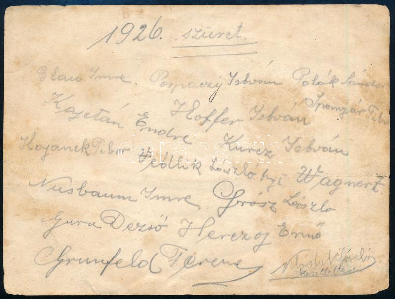 Beschreibung: 1926 Szüret, zsidó fiatalok csoportképe, fotó, a hátoldalon feliratozva, a képen szereplők aláírásaival, viseltes állapotban, 12x9 cm
