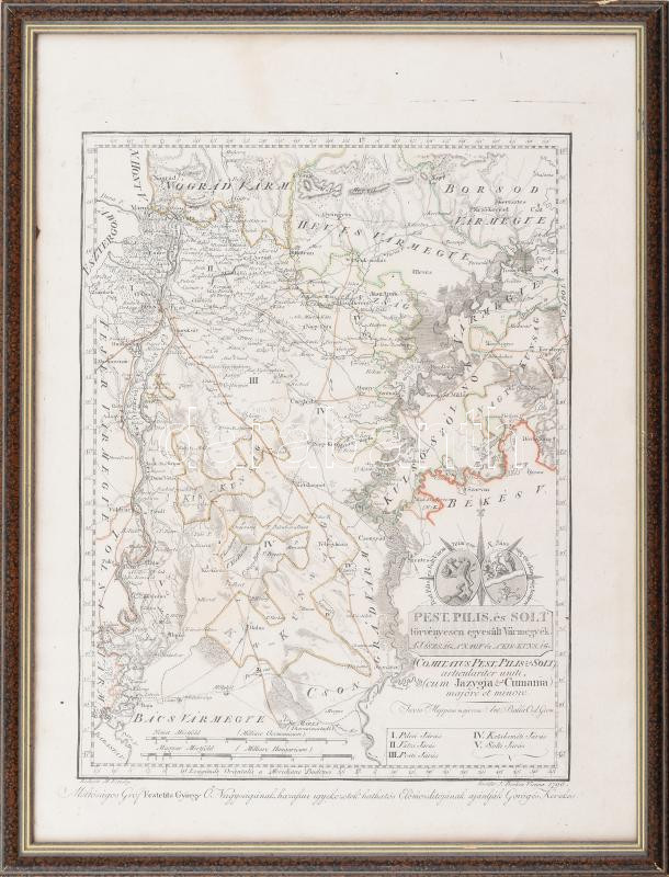 1796 Balla Antal (1739-1815): Pest, Pilis és Solt törvényesen egyesült vármegyék. A Jászság, a Nagy- és a Kis-Kunság. (Comitatus Pest, Pilis & Solt articulariter uniti, cum Jazygia & Cumania majore et minore). Rézmetszetű térkép. Metszette: J. Berken, Vienna (Bécs). A dúc alján gróf Festetics György (1755-1819) szabadkőműves, nagybirtokosnak szóló ajánló sorokkal. Üvegezett fakeretben, 32,5x25,5 cm