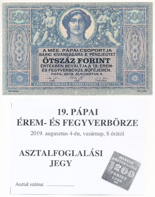 Beschreibung: Pápa 2019. augusztus 4. 500Ft "MÉE 19. Érem- és Fegyverbörze" alkalmi pénz + asztalfoglalási jegy T:UNC