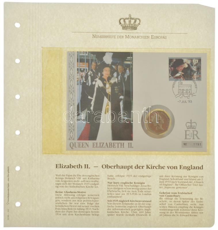Nagy-Britannia 1993. "II. Erzsébet, az anglikán egyház feje", benne 1993. 50p Cu-Ni érmés borítékban bélyeggel, bélyegzéssel, német nyelvű tájékoztatóval T:UNC
