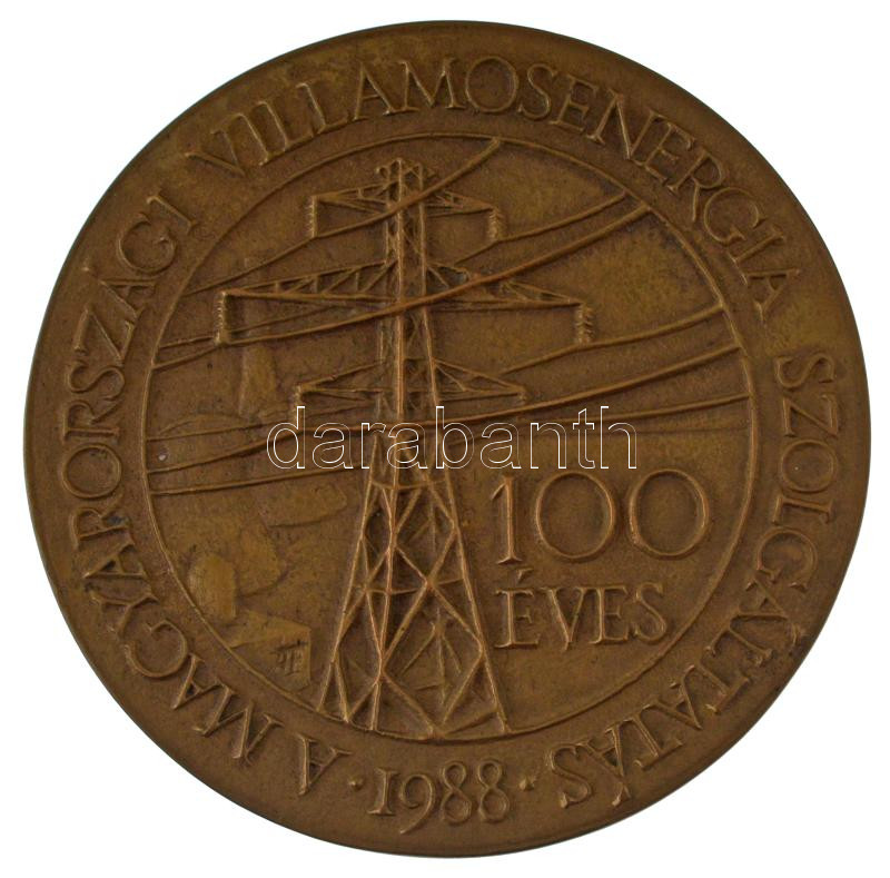 1988. "100 éves a magyarországi villamosenergia szolgáltatás - 1988 / Magyar Villamos Művek Tröszt" bronz emlékérem eredeti, kopottas dísztokban (79mm) T:XF