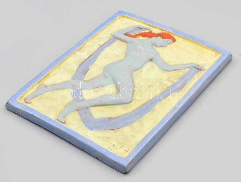 Beschreibung: Eschenbach Jenő (1908-1981): cca 1930 Art deco táncosnő, mázas kerámia falikép, mindkét oldalán jelzett, minimális kopottsággal, 29,5x22 cm