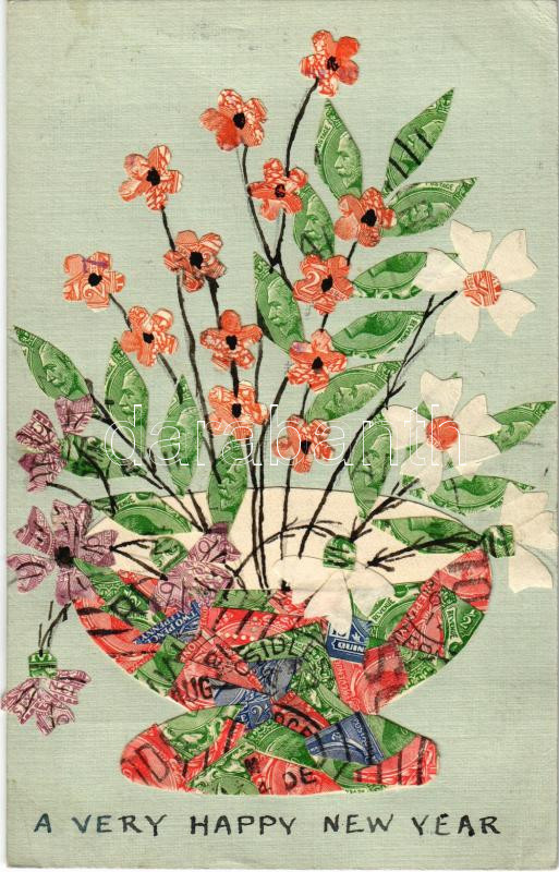 Bélyegekből kivágott és összeragasztott képeslap / Stampcard with flow... https://www.darabanth.com/de/446-Fernauktion/446.0/Ansichtskarten/Briefmarken~2000019/Belyegekbol-kivagott-es-osszeragasztott-kepeslap-Stampcard-with-flowers-and-New-Year-greetin~II2954979