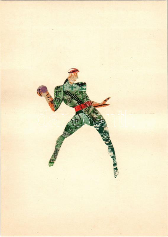 Beschreibung: Kézilabdázó. Bélyegekből kivágott és összeragasztott képeslap. Budai nyomda / handball player. Made out of stamps