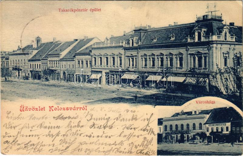 1900 Kolozsvár, Cluj; Takarékpénztár épület, városház, Csiky Mihály, Csillag Manó, Bányai Sámuel és fia, Hubay Károly üzlete, gyógyszertár / savings bank, town hall, shops, pharmacy